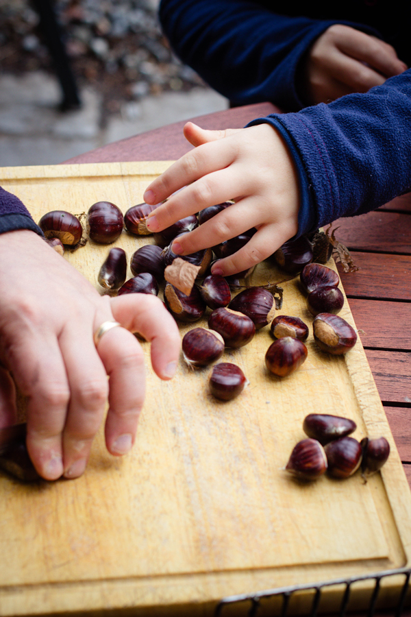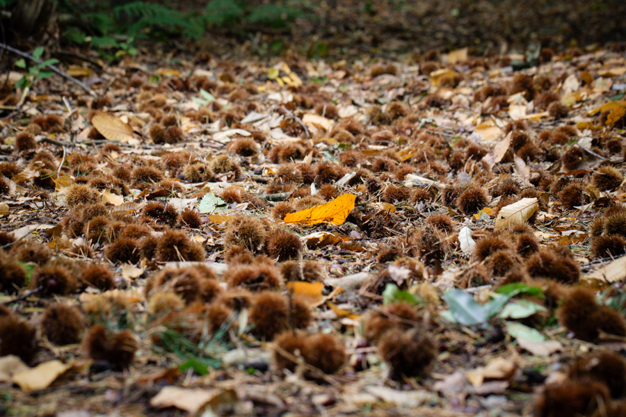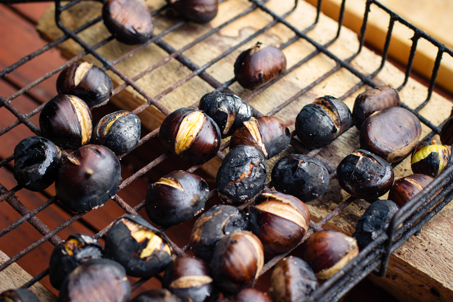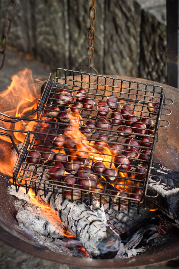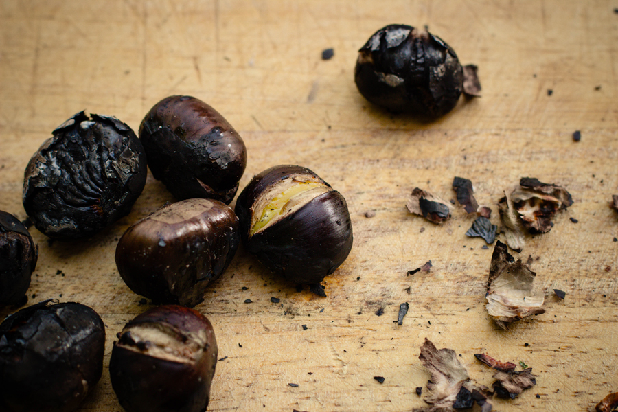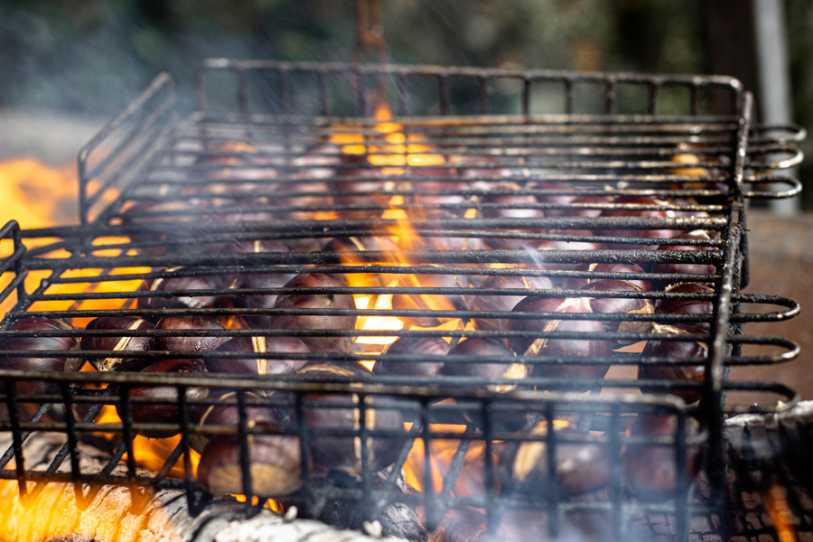 A pas feutrés sur les feuilles, regards complices, on s’assure de ne pas être vu. Et c’est parti! les bogues ouvertes sont comme des coffres au trésor. Puis vient le feu, la fumée, le crépitement. Les châtaignes noircissent sur la grille et l’odeur qui s’élève nous ramène à l’essentiel : le partage, la lenteur, la joie rustique.